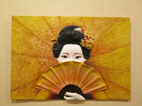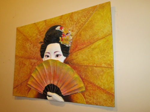 アクリル絵具で描かれ、マット・セミマット・グロスの数種類の無色ニスで仕上げられています。